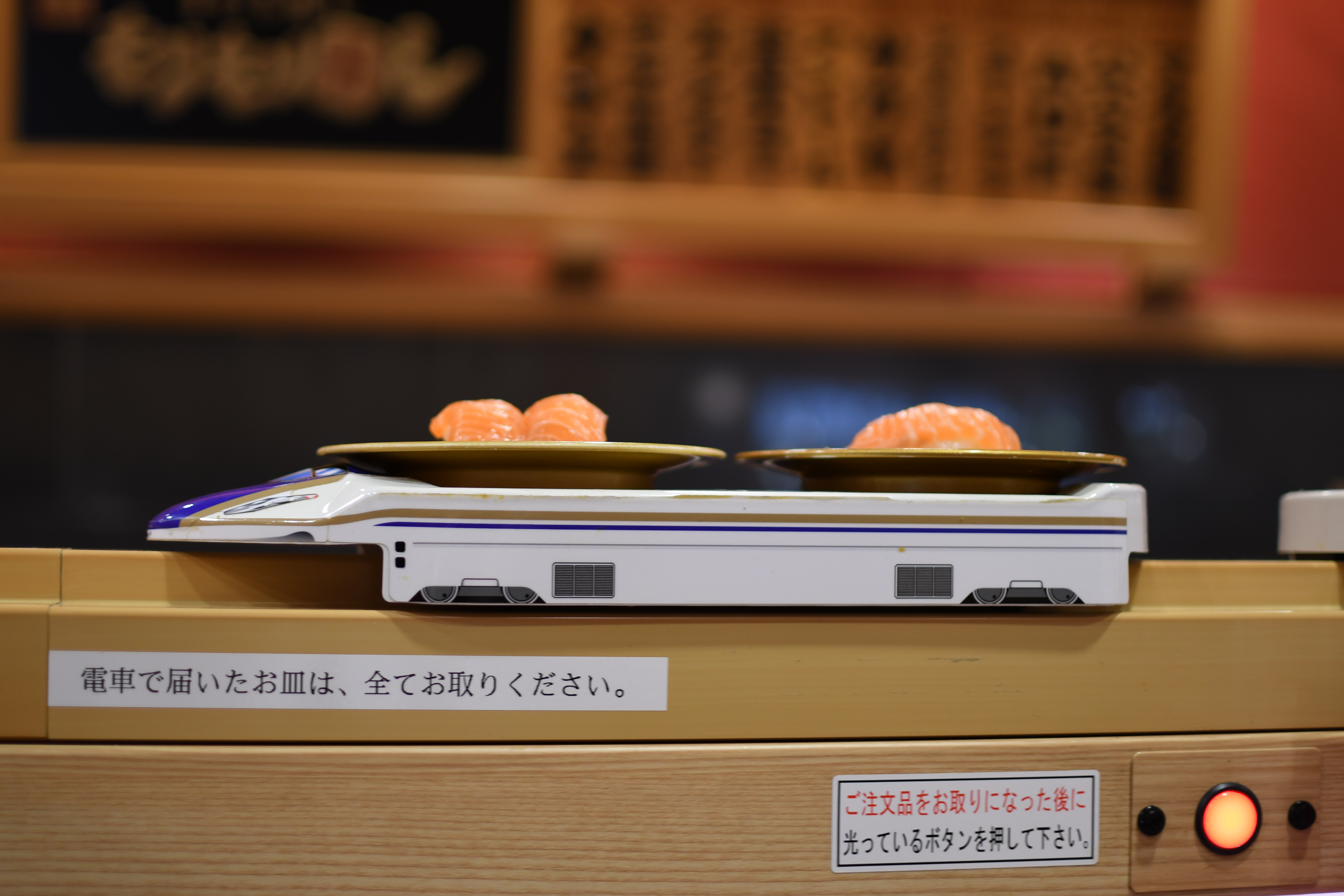 Shinkansen Sushi isn’t a technical term — it’s just what we called it. In Europe, you might know it better as running sushi. The concept is basically the same: there’s a little conveyor belt with plates of sushi passing by.