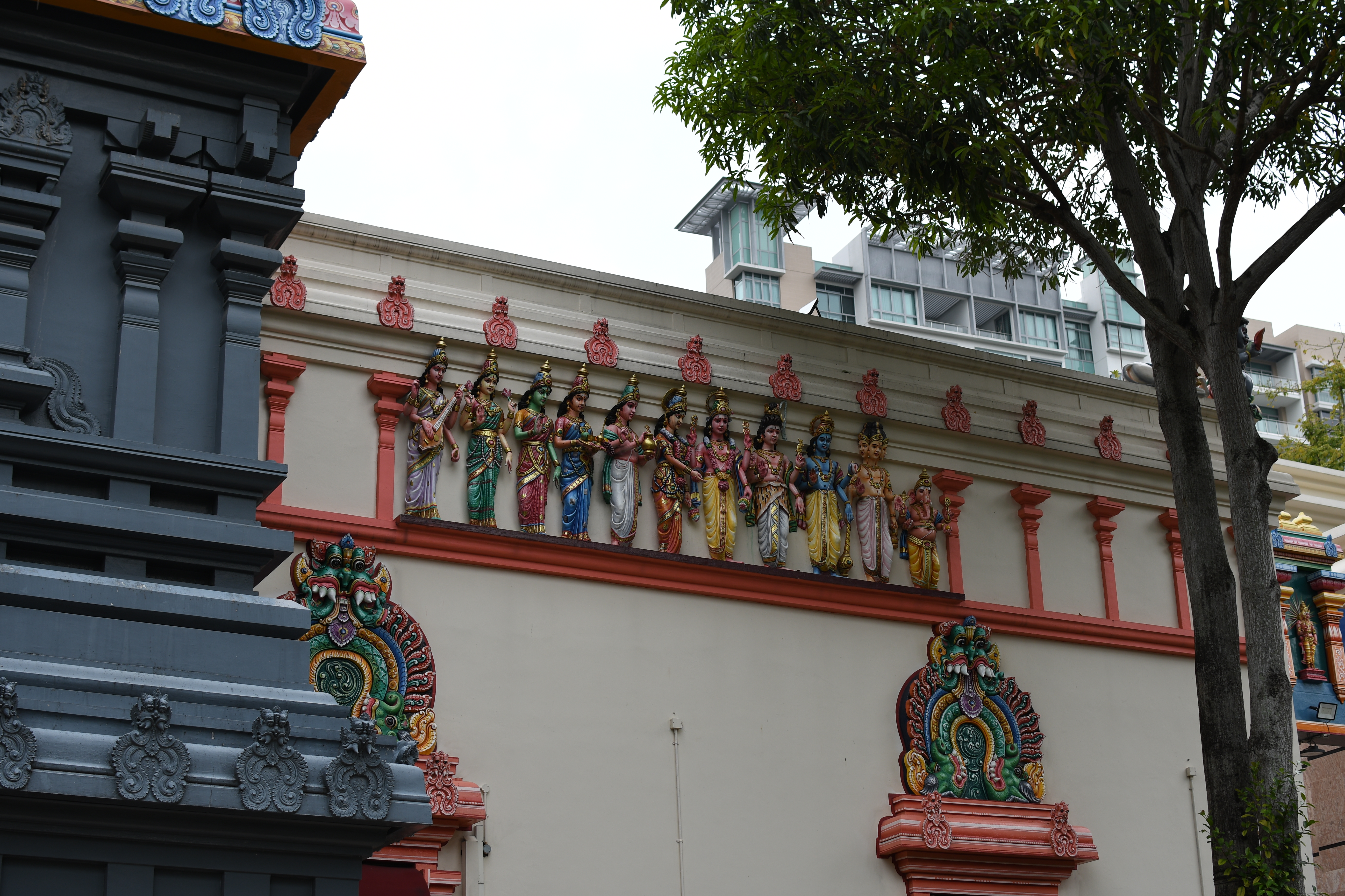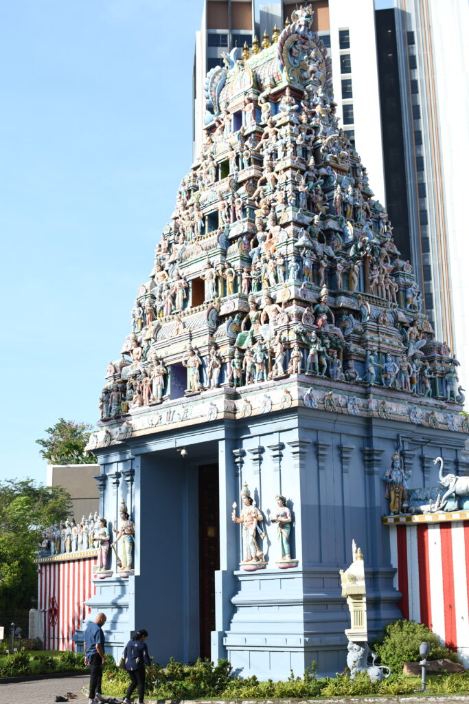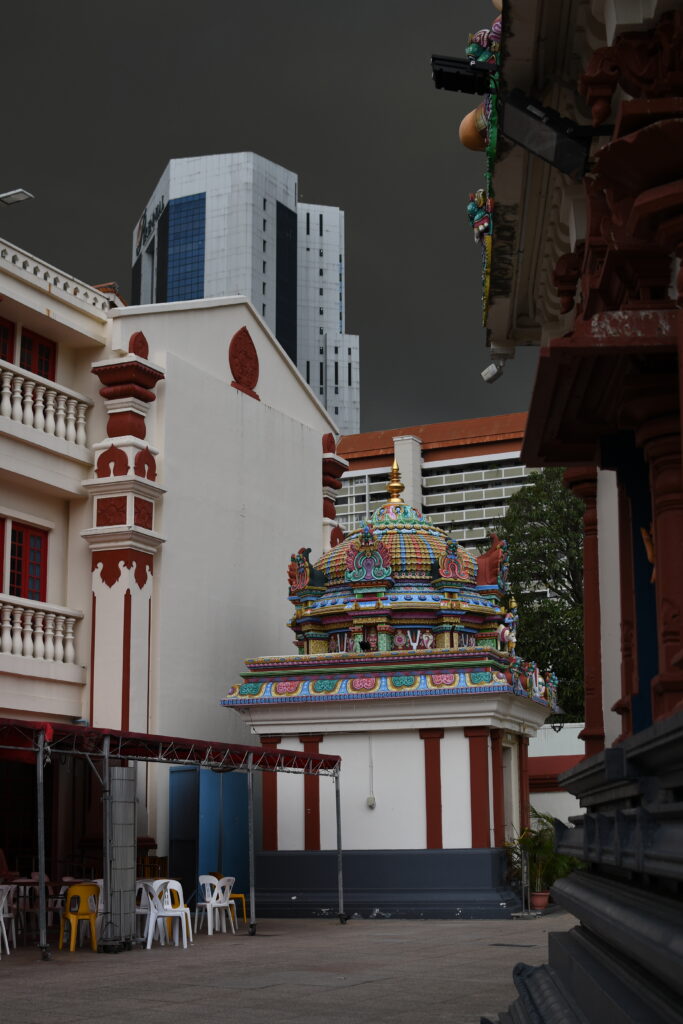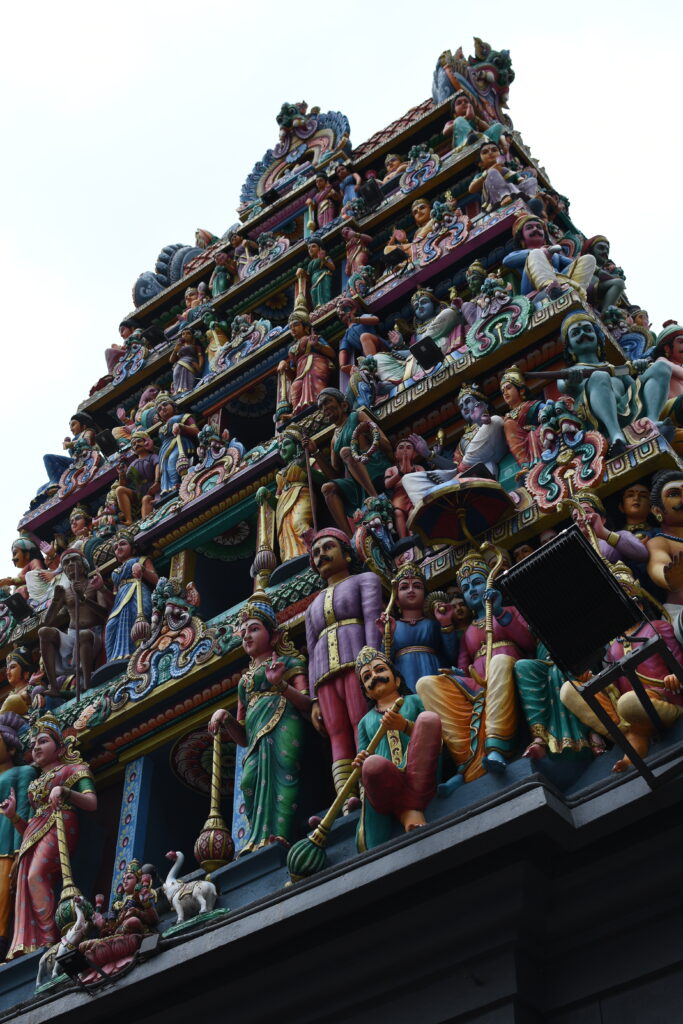 A rather futuristic-looking Hindu temple can be found in Chinatown. The Sri Mariamman Temple lies between Chinatown Station and the Buddha Tooth Relic Temple. This large city complex kindly offered us refuge just before the rain poured down.