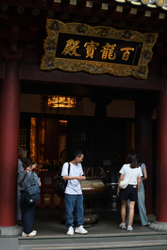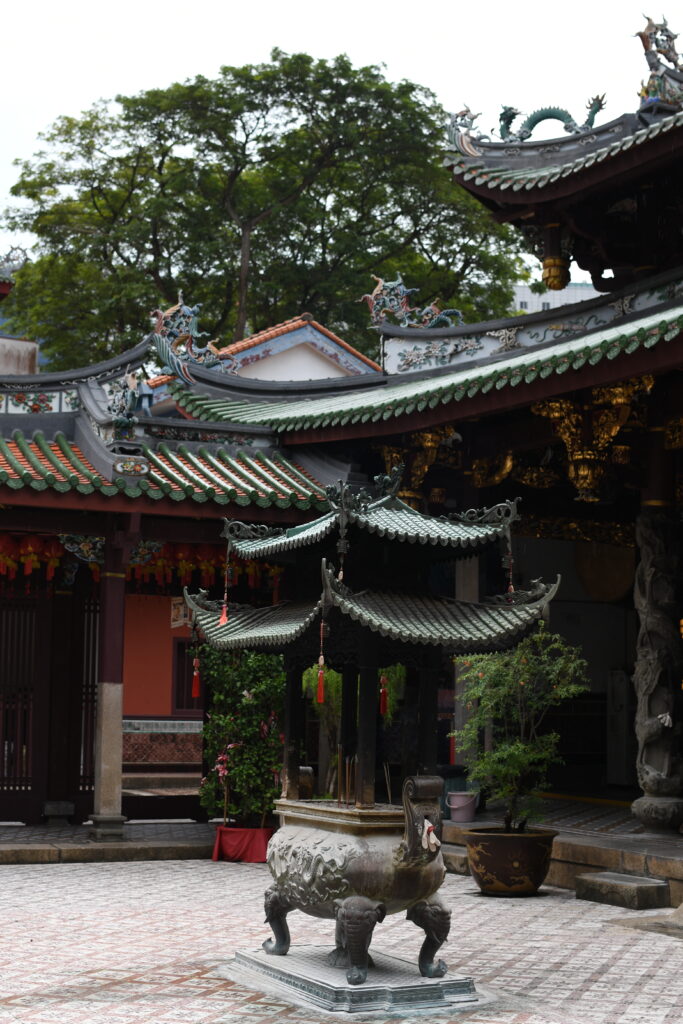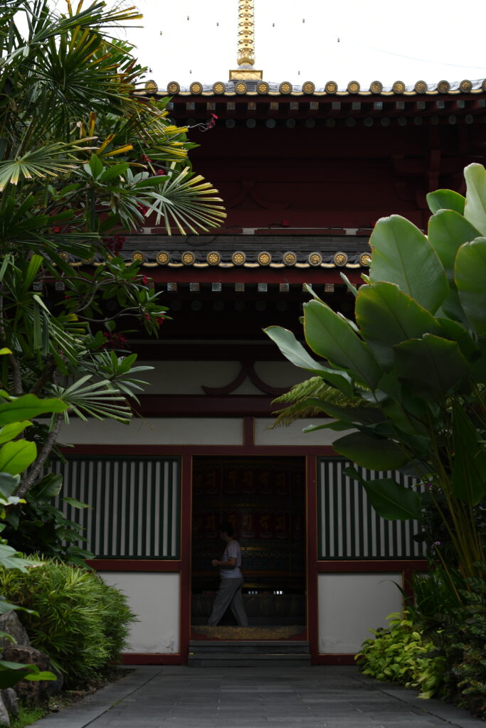 The Buddha Tooth Relic Temple was my personal highlight. Massive, free to enter, and full of things to explore, it offered a truly memorable experience. On the ground level, an ongoing ceremony filled the air with Buddhist chanting; on the mid-level, an intriguing Buddha museum awaited; higher up, a meditation hall invited reflection; and on the roof, a garden with a prayer bell crowned the temple. The rooftop garden was gorgeous, adorned with red frangipani, while the meditation hall deeply inspired me. It was a peaceful haven in the midst of the buzz of this metropolis. Men and women of all ages seemed to come here – whether from home or during their workday – to find a quiet moment for themselves. I could relate to them more than ever, reminded once again that humans, regardless of background or roots, share more in common than we sometimes realize.